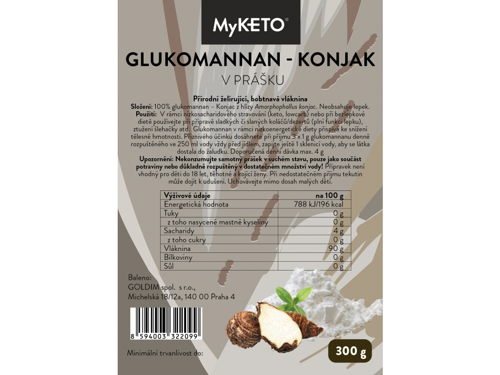 Použití: V rámci nízkosacharidového stravování (keto, lowcarb) nebo při bezlepkové dietě používejte při přípravě sladkých či slaných koláčů/dezertů (plní funkci lepku), ztužení šlehačky atd. Glukomannan v rámci nízkoenergetické diety přispívá ke snížení tělesné hmotnosti. Příznivého účinku dosáhnete při příjmu 3 x 1 g glukomannanu denně rozpuštěného ve 250 ml vody vždy před jídlem, zapijte ještě 1 sklenicí vody, aby se látka dostala do žaludku.Recepty v low carb stylu naleznete na našem webu nebo u odkazu ZDE.