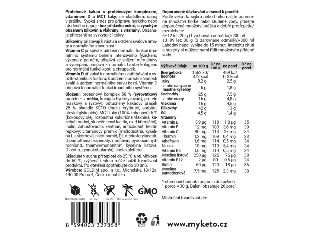 Poctivé proteinové kakao! S chutí lahodné horké čokolády. Bohaté na proteiny, vitamíny C, D, E, vitamíny skupiny B, MCT tuky z kokosu a unikátním keto sladidlem namísto běžného cukru. Nápoj v prášku. Dopřejte si kvalitní Proteinové kakao už dnes! Keto friendly. Pro dospělé, teenagery a děti od 6 let.